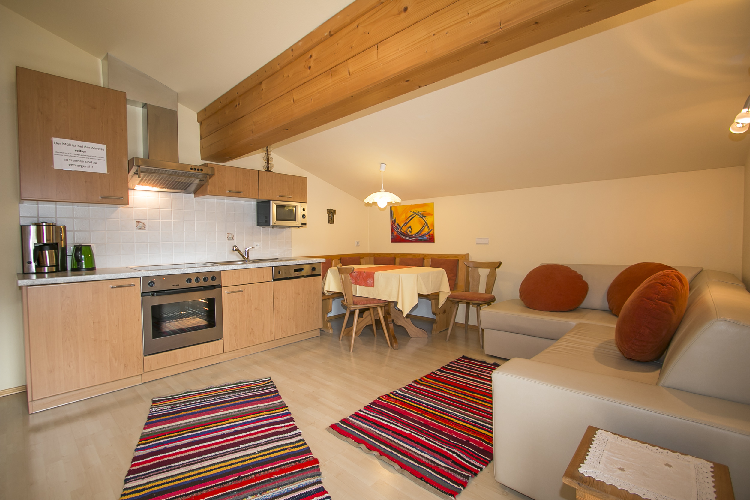 ● Große Wohnküche mit Schlaflounge (Größe wie ein Doppelbett) – mit durchgehender Schaumstoffmatratze und hochwertigem Stoffbezug, daher sowohl als gemütliches Sofa als auch als vollwertiges Bett nutzbar